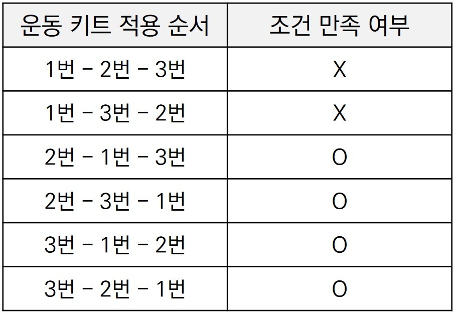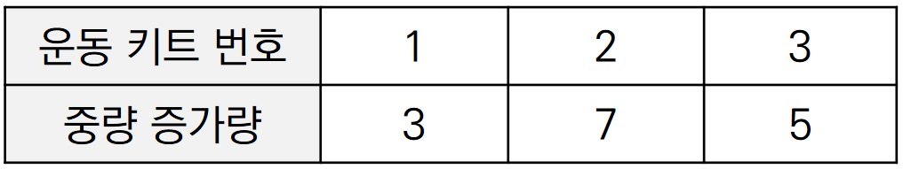 반면에 3번, 1번, 2번 순서대로 운동 키트를 적용한다고 해보자. 그러면 1일차부터 운동을 모두 마친 날까지의 모든 시점에 대하여 항상 중량이 500이상이 된다.