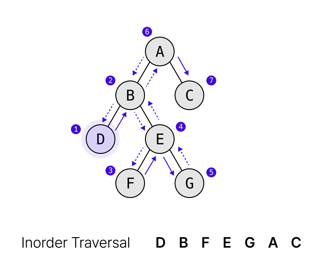 - 밑의 그림에 자세히 왼쪽 자식 노드 D부터 시작해서 트리의 중위 순회를 하면 DBFEGAC가 나온다.