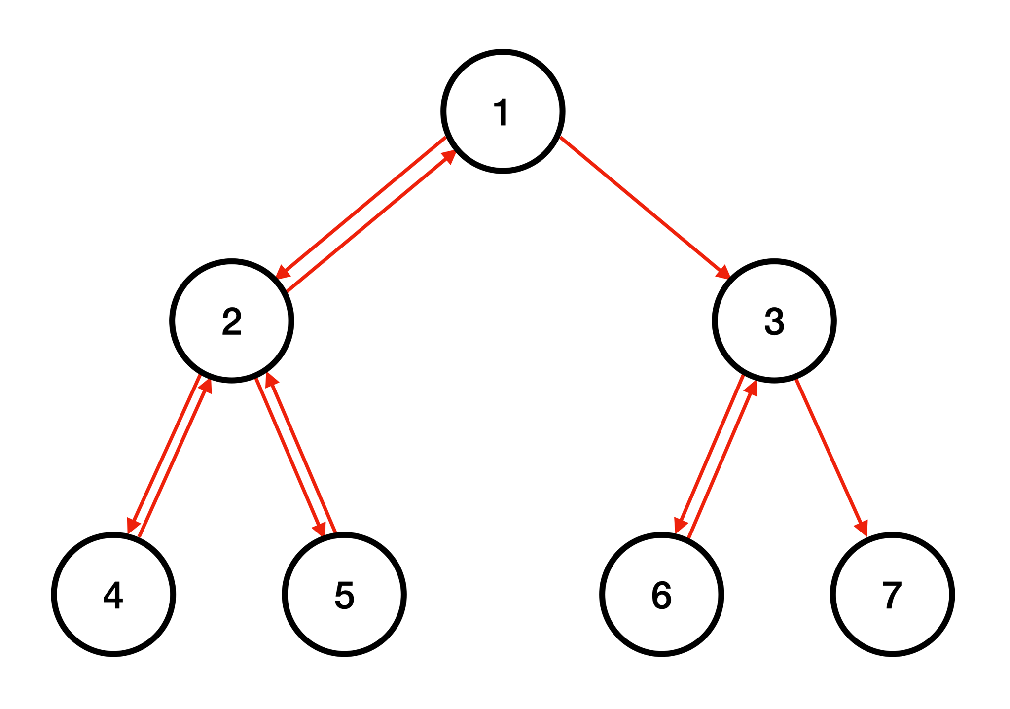 유사 중위 순회는 위 그림과 같이 루트인 노드 1에서 시작하여 노드 7에서 끝나고 1→2→4→2→5→2→1→3→6→3→7 이와 같은 순서로 순회를 진행한다. 유사 중위 순회를 진행하면서 총 10번 이동하였다.