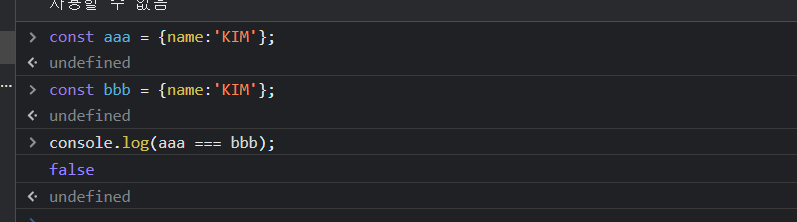 변수 aaa와 bbb는 각자 다른 주소를 바라보고 있으므로 두 객체는 다르다고 나온다.