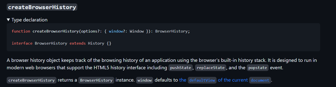 createBrowserHistory는 BrowserHistory를 반환하는데, 이 객체는 브라우저의 스택을 활용해서 브라우징을 추적하는 객체이다. HTML5의 history interface를 지원하는 웹에서 지원되는 것을 알 수 있다.