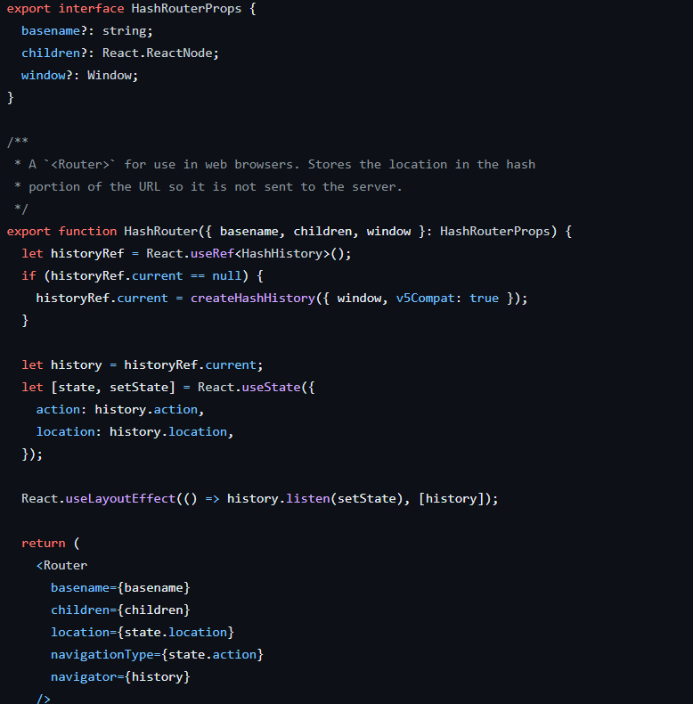 @remix-run/router 패키지의 BrowserHistory를 useRef로 참조를 historyRef에 처음에 저장한다.